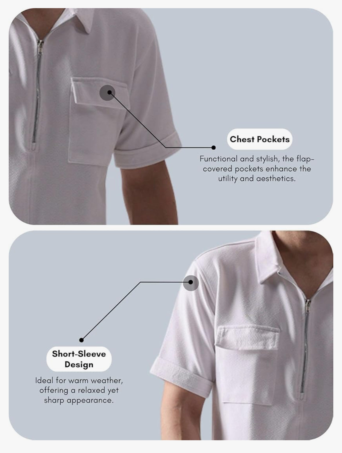 UrbanAura.Co Men’s Solid Half Sleeve Zipper Shirt | Streetwear Casual Shirt (White/Black)